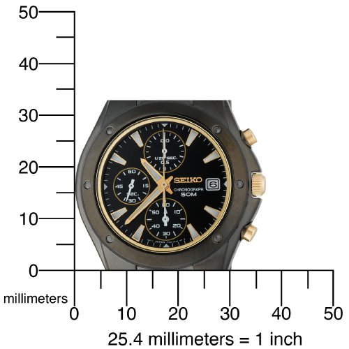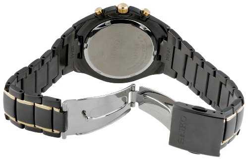 Presenting a depth of features, this Seiko Men's Chronograph Black Ion Watch #SND641 features a dramatic black dial face, embellished with contrasting hour and minute indexes for a stand-out effect, and is protected by a hardlex dial window. A handy date calendar rests at the three o'clock position, and three sub-dials provide precise chronograph timing for a variety of activities. A black stainless steel band is adorned with contrasting gold-tone accents with a sturdy fold-over-with-push-button clasp. Other details include a 40-millimeter titanium case, and a titanium bezel that is stylishly adorned at each hour mark with raised studs. Powered by quartz movement, this watch is water resistant up to 50 meters.